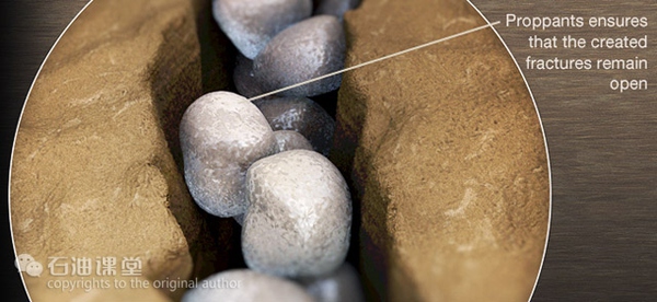 继续注入携带支撑剂的液体,裂缝逐渐向前延伸,支撑剂起到支撑裂缝作用,形成了具有一定尺寸的高导流能力的填砂裂缝,使油气轻松地通过裂缝流入井中,达到增产增注效果。