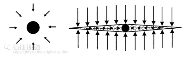 压裂后形成的裂缝由井底延伸至地层深处。油气由径向流转变为双线性流,更容易流入井筒。
